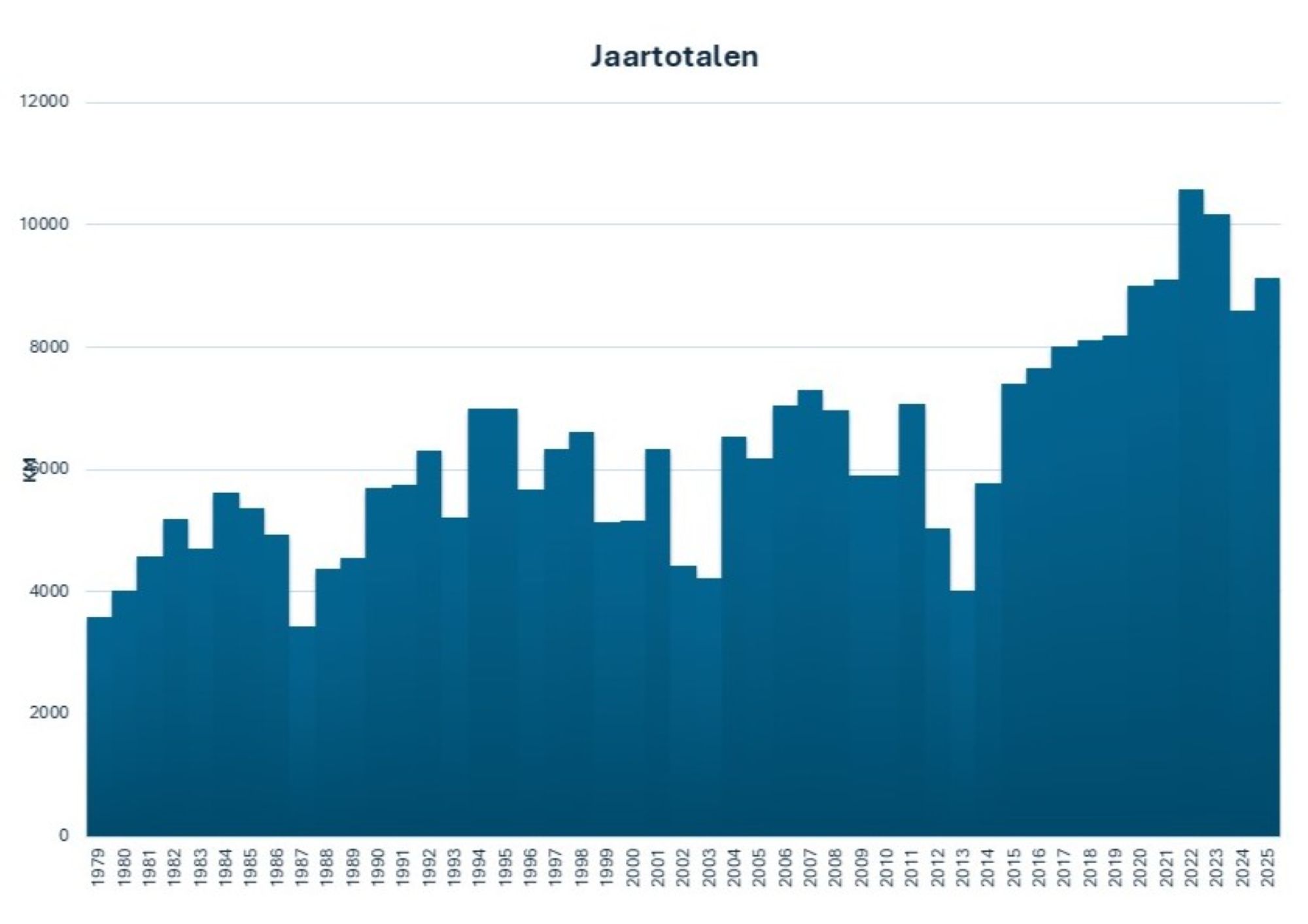 Denk dat alle individuele duursporters de prestaties, tijden, afstanden, records bij houden. Vanaf 1979 deed ik dat ook. In die eerste jaren door met garen de route op de kaart na te trekken en het afgeknipte touwtje langs de liniaal te vermenigvuldigen met de schaal van de kaart. Later kwamen de kleine fietscomputertjes die telden hoe vaak de sensor op het voorwiel langs kwam en dat vermenigvuldigden met de opgegeven wielomvang. En nog weer later met – steeds meer geavanceerde – GPS-fietscomputers. Op 31 december 2025 in totaal 295.050 kilometer