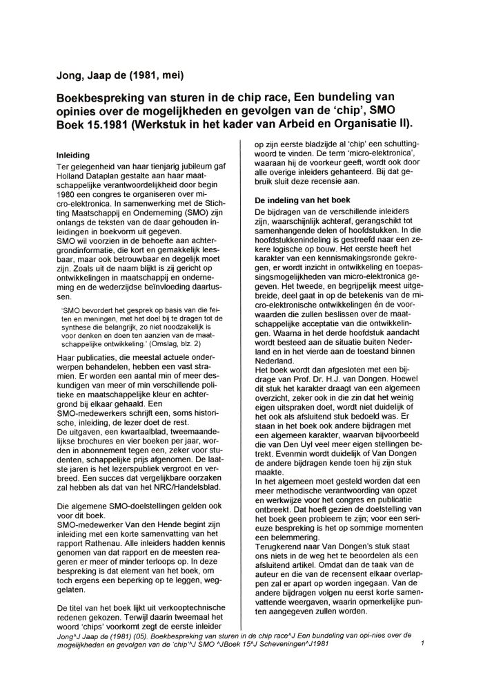 Als afronding van een collegereeks in Arbeids- en Organisatiesociologie moest ik een werkstuk inleveren. Dat werd een uitgebreide en kritische bespreking van een bundel waarin de inleidingen waren opgenomen van een congres over micro‑elektronica.